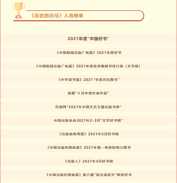 新华社北京12月19日电 近日,中共中央宣传部印发表彰决定,对第十六届精神文明建设“五个一工程”组织工作先进单位和优秀作品进行表彰。北京出版集团旗下北京十月文艺出版社出版的图书《远去的白马》《平安批》入选“优秀作品奖”。