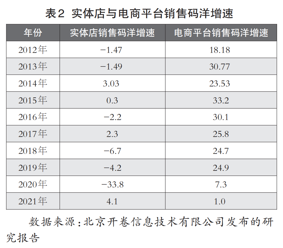 人口结构的互联网化,使得电商发展趋势进一步强化和巩固。电商平台图书销售逐年大幅增长,销售占比不断扩大。开卷数据显示,2013~2019年,电商平台图书销售的增长率长期保持在20%以上的高位快速增长,2021年受疫情影响,增长率才开始走平,实现正增长7.3%。而实体门店的图书销售在2012年之后一直是低位数增长,其中一半以上还是负增长,特别是2020年受疫情影响,同比下降了33.8%(见表2)。