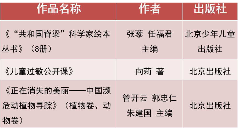 4月4日,科技部公布了2022年全国优秀科普作品推荐工作评选出的100部(套)优秀作品名单,北京出版集团共3种图书入选,分别是:北京少年儿童出版社出版的《“共和国脊梁”科学家绘本丛书》(8册);北京出版社出版的《儿童过敏公开课》和《正在消失的美丽——中国濒危动植物寻踪》(2册)。