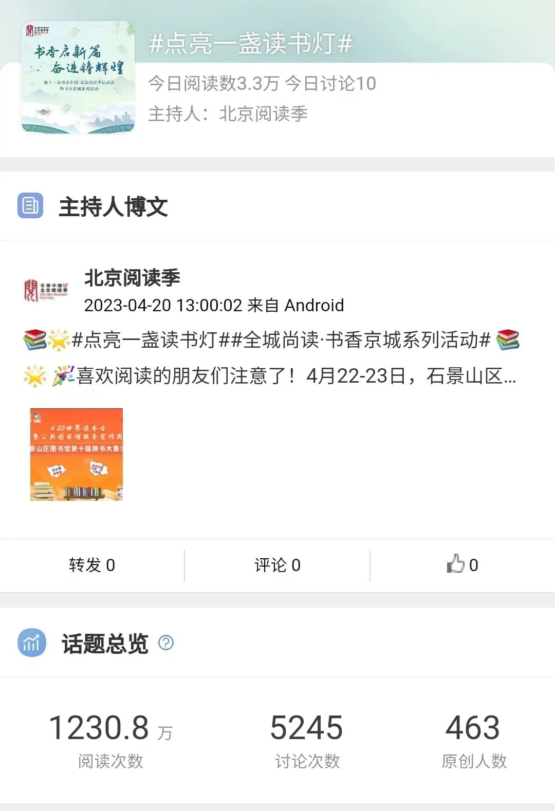 活动简介:2023年世界读书日期间,北京开展“点亮一盏读书灯”活动,鼓励实体书店、特色阅读空间以及全社会积极参与,助力书香京城建设。