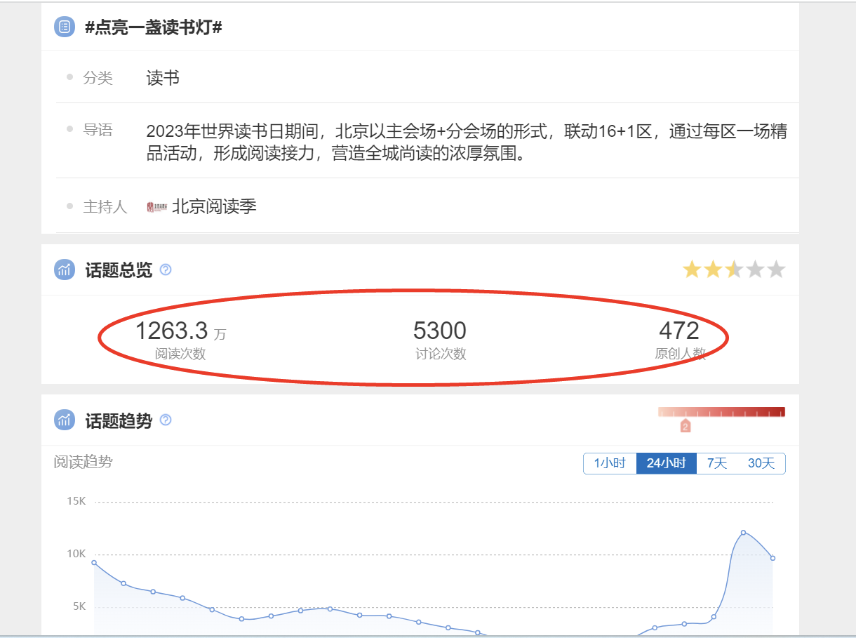 4月23日世界读书日期间,北京书市朝阳公园主会场将举行第十三届书香中国·北京阅读季启动式暨书香京城系列活动,并将在全市各大实体书店开展点亮一盏读书灯主题推广活动。据统计,将开展120余场全城尚读·书香京城系列活动;100余家特色阅读空间(实体书店)参与“#点亮一盏读书灯#”微博话题互动活动。新浪网、优酷、搜狐网、凤凰网、微博、快手、网易、抖音、掌阅、爱奇艺等50余家网络平台,开展E阅读等数字阅读推广活动,网上网下全面发力,助力书香京城建设。