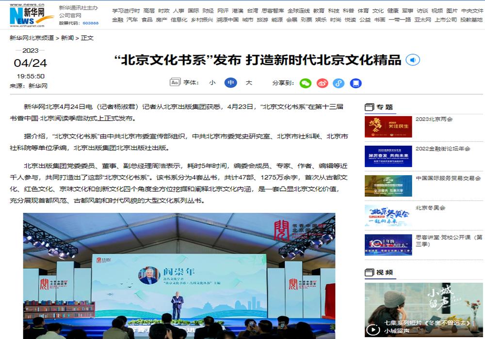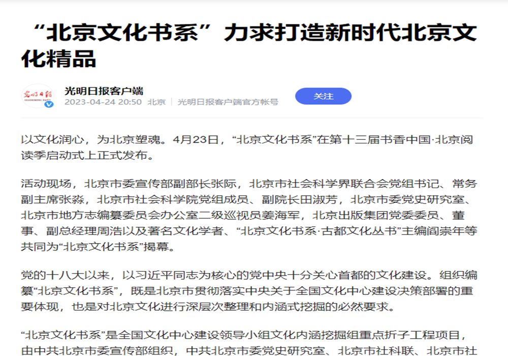 在4月23日举办的第十三届书香中国•北京阅读季启动式上,集团发布重磅力作“北京文化书系”,打造新时代北京文化精品,恰逢其时、意义重大。