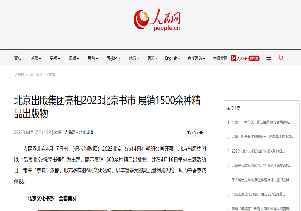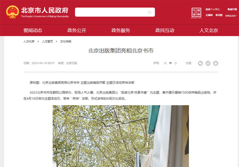 最美四月天,读书正当时。朝阳公园内,2023北京书市热度空前,北京出版集团展位好书荟萃、读者云集;第十三届书香中国·北京阅读季盛大启幕,集团在启动式上隆重首发“北京文化书系”并参与多个环节;“世界读书日”期间,集团及旗下各子(分)公司连续组织举办20余场丰富多彩的特色阅读活动,形成阅读接力,引领“爱读书、读好书、善读书”的社会新风尚,深入推进全民阅读,助力全国文化中心建设和书香京城建设。