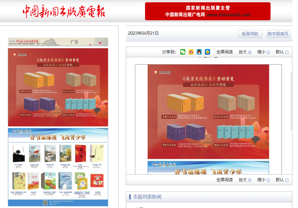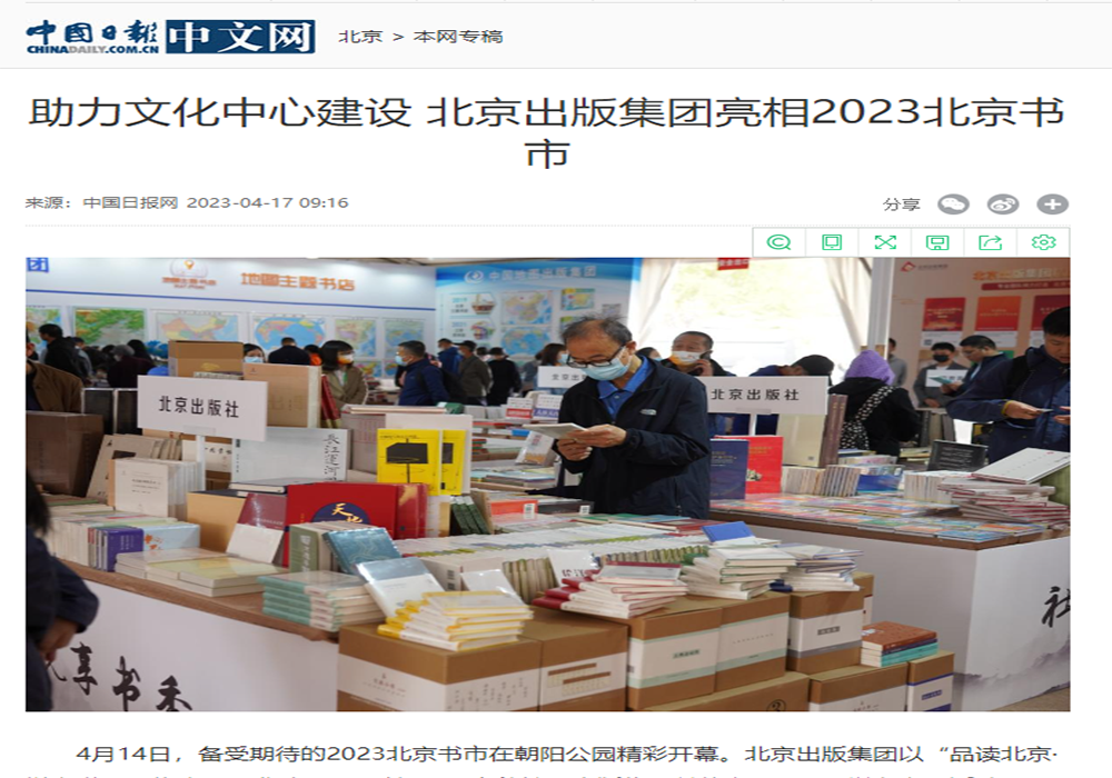 在北京市委宣传部、书市组委会组织协调下,各级领导大力支持推进下,新华社、人民日报(客户端)、光明日报、北京日报、北京广播电视台、中国新闻出版广电报等20余家主流中央、市属、行业媒体围绕集团参展2023北京书市、举办“世界读书日”系列活动、多种产品荣获大奖及“北京文化书系”、《瓦屋山桑》、《天鹅荡》、《老龄知识百问百答》等新品佳作面世,刊发首发报道近百篇。