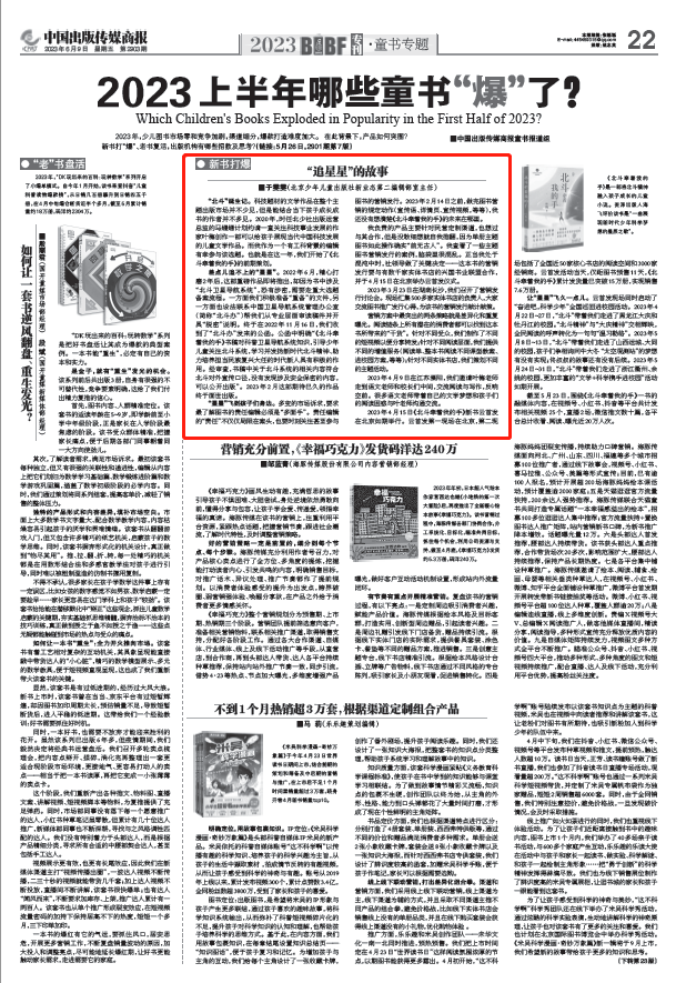 本文节选自《中国出版传媒商报》(2023年6月9日 22版)《“追星星”的故事》,作者为北京少年儿童出版社新业态第二编辑部室主任于雯雯。