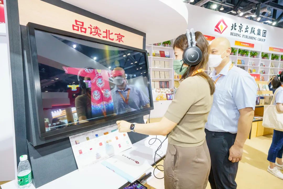 融媒体展区内,集团通过数字终端集中展示百余种精品数字出版物、融媒体产品、知识服务平台。如以“内容+渠道”的创新探索完成“文学出海”的《我与地坛》《采桑子》《去年天气旧亭台》等北京优秀文学作品英文有声书;入选2022年全国有声读物精品出版工程的“北大红楼与中国共产党创建历史丛书”有声书,获第八届中华优秀出版物音像电子出版物提名奖、2022年向全国青少年推荐百种优秀出版物的“中国科学家的故事——数字项目”等。与此同时,集团还现场设置了英文AR虚拟讲解员、AR北京文化图书天幕等,为展商、读者营造沉浸式数字阅读体验。