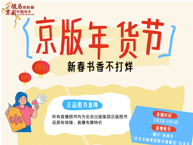 骏马贺新春,京彩中国年。新春的脚步悄然临近,年味渐浓之时,总要有书香相伴。为让广大读者在团圆佳节里,既能感受年味暖意,也能汲取文字力量,北京出版集团精心策划“百种图书百场直播”京版年货节直播活动,以书...