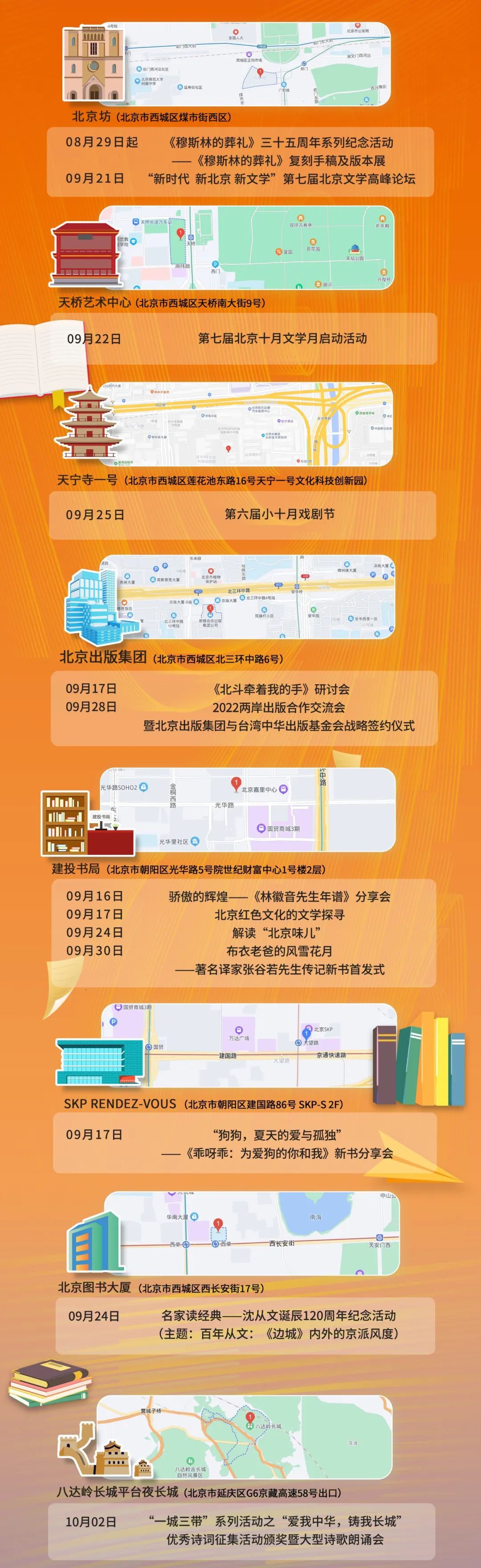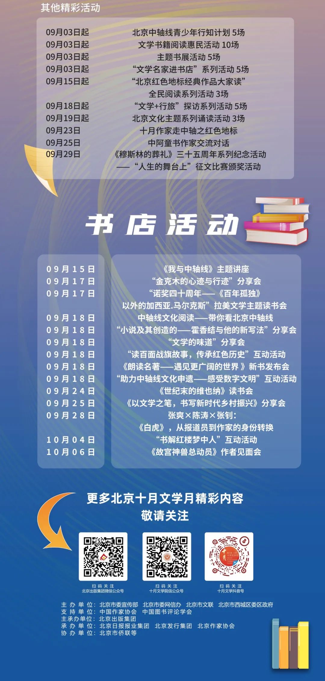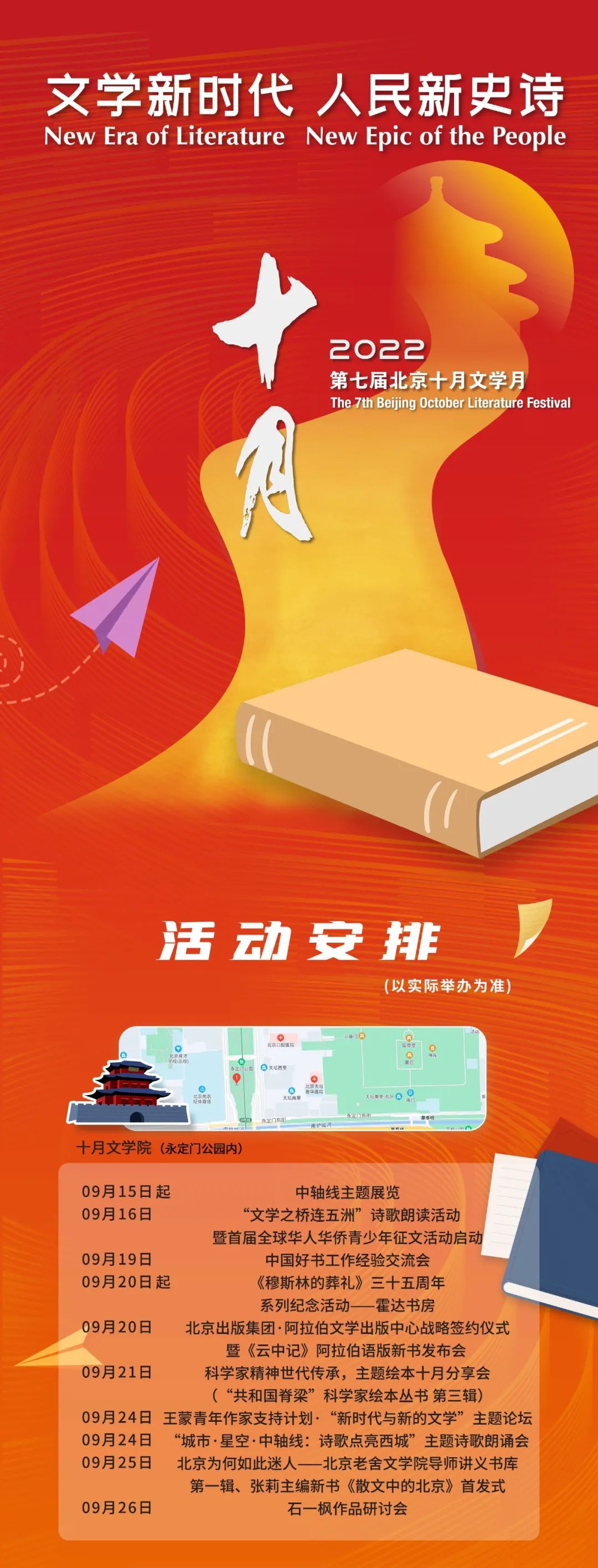 北京十月文学月创办于2016年,是以“十月”文学品牌为核心,以文学界和出版界为主体,社会各界广泛参与的全市性文学主题活动,现已成为培育优秀作家、优秀作品的摇篮,成为全民阅读、“书香京城”的靓丽风景,成为立足北京、辐射全国、放眼世界的一张文学金名片。今年第七届北京十月文学月由北京市委宣传部等单位主办,中国作家协会、中国图书评论学会支持,北京出版集团主承办。大会以“文学新时代•人民新史诗”为主题,汇聚北京与全国优质文学资源,开展丰富多彩的文学活动近百场。本届文学月将于9月初开始,持续至10月初。